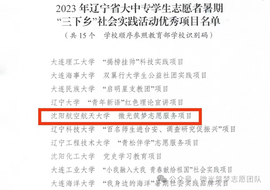 近日,共青团辽宁省委员会发布《关于2023年度辽宁省大中专学生志愿者暑期文化科技卫生“三下乡”社会实践活动通报》,经各市各高校推报,省级团委审核、组织评议等环节,“微光筑梦”志愿服务项目被评为优秀项目。